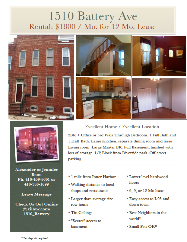 Two large bedrooms with a large walk through bedroom/office area. Separate dining room and large eat in kitchen. Off Street parking. Large basement for storage. Great neighbors, ideal location close to the Inner Harbor, shops, restaurants, park and more! Email for more pictures or details. Small Pets OK
